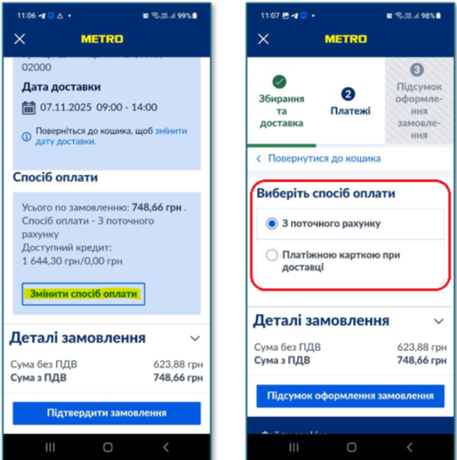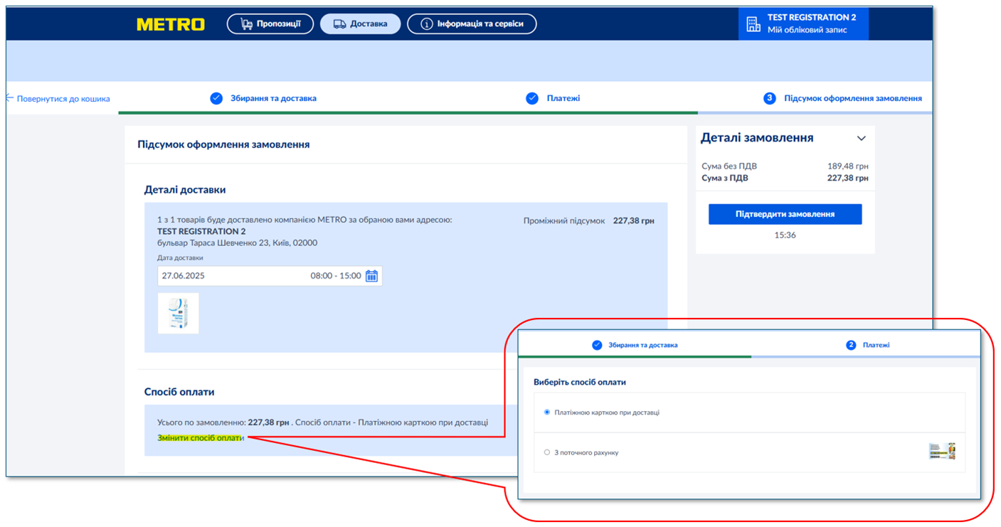 To change the default payment method, you must use the "Place an order" button (to see it, you need to move to the bottom of the page using the scroll bar) and in the "Payment method" section, click "Change payment method":