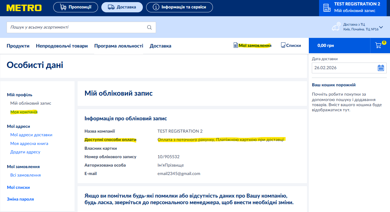Щоб побачити налаштовані способи оплати потрібно на сайті скористатися кнопкою «Мої замовлення» , що розташована у верхній правій частині екрану та доступна на будь-якому етапі створення замовлення. Далі в розділі «Мій профіль» треба обрати пункт «Мій обліковий запис». Доступні способи оплати будуть відображені у відповідному рядку: