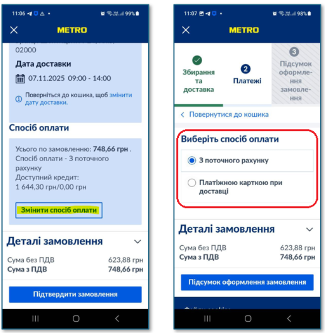 Якщо ви створюєте замовлення у застосунку, то перелік способів оплати відображається, якщо натиснути на кнопку «Змінити спосіб оплати», яка доступна після того, як ви оберете "Оформлення замовлення" у кошику: